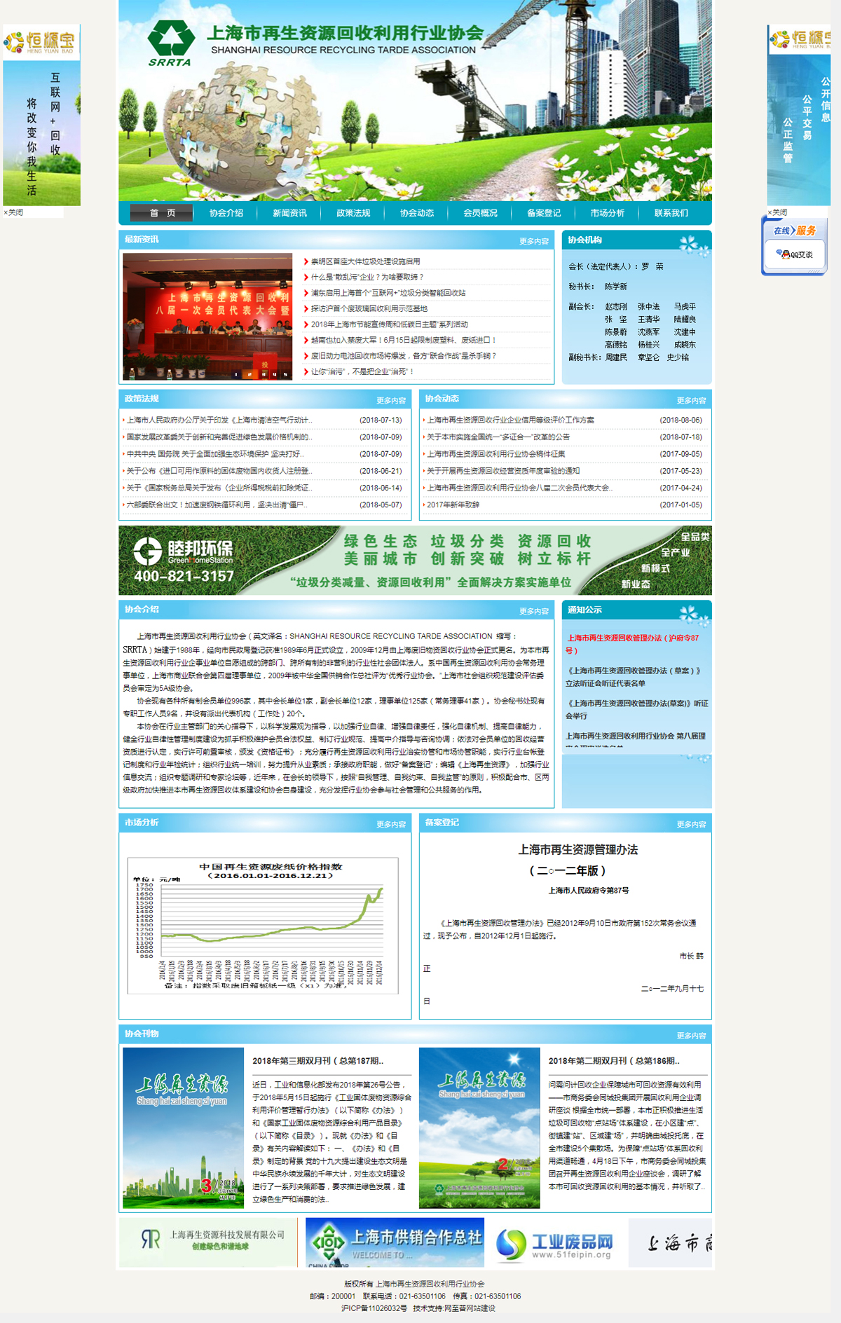 上海市再生資源回收利用行業(yè)協(xié)會(英文譯名: SHANGHAI RESOURCE RECYCLING ASSOCIATION 縮寫: SRRA)始建于1988年,經(jīng)向市民政局登記獲準1989年6月正式設(shè)立,2009年12月由上海廢舊物資回收行業(yè)協(xié)會正式更名。為本市再生資源回收利用行業(yè)企事業(yè)單位自愿組成的跨部門、跨所有制的非營利的行業(yè)性社會團體法人。